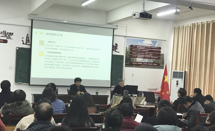 会上,丁克伟作为学院任教教授率先述职,他结合PPT从立德树人、教育教学改革、科研成果与社会服务、青年教师培养、学生培养等方面做了详细报告。其他教授也依次对各自一年来的工作向全体教师作了汇报。