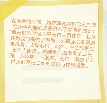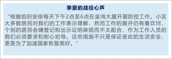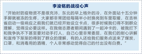 后来,越来越多的普通市民加入到志愿服务的队伍中来,李英浩又主动申请调到夜班的岗位,他说:“看到大家齐心协力的坚定模样,我对打赢这场保卫战有了更大的信心!我年轻,就让我来值晚班吧!”