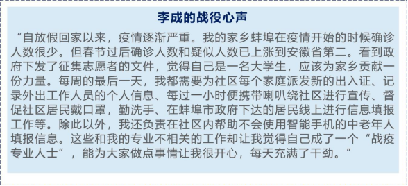 安徽太湖 19级土木工程专业四班的张了然每天都在居民楼胡同口检查进出人员的居民通行证。一开始张了然的家人因为担心他的安全并不同意他去协助社区的疫情防控工作,“一己之力,聚可搬山,我是大学生我要行动起来。”张了然坚定的说。最终张了然的坚持换来了家人的理解和支持,也为张了然感到骄傲。