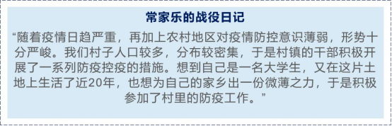 陕西渭南 18级土木工程专业的常家乐同学老家在陕西省渭南市富平县,作为大学生的他看到村里的老人们对疫情不够重视,于是他就担当起了向村里的老人们介绍疫情的发展情况与防护的措施的宣传员。劝说乡亲们尽量少出门乃至不出门,不聚集、戴口罩,保障自身和他人的安全。同时他也在村子的出入口劝返来往车辆,防止人员流窜。穿上老家的军大衣,常家乐又开始当起了“夜间巡护员”这项工作是从晚上八点到次日早上八点,他需要核查出入村里的人员信息并登记出入时间、事由等。
