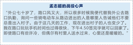 张文旭的日记中写到“这个时节正是我们当地养殖户放蟹苗的时候,出行车辆较多,我们志愿者的任务也比较重,虽然有时会比较辛苦,但是我认为很值得,希望能够早日战胜疫情。”