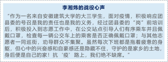 福建泉州 土木工程学院17级道路桥梁与渡河工程专业二班的李湘炜积极响应家乡团县委的号召,助力公交车运营、巡街劝导等疫情防控工作。