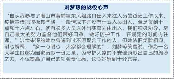安徽潜山 18级城市地下空间工程专业的刘梦琼从正月初二开始就帮助母亲登记需要购买感冒药、发热药物人员的工作,每天整理信息并反馈到上级指挥部门。后来,她又加入到路口登记员的队伍中,负责出入来往人员的身份核查和登记工作。