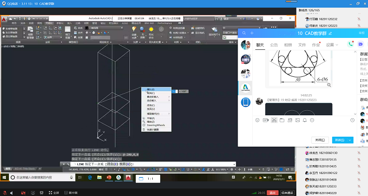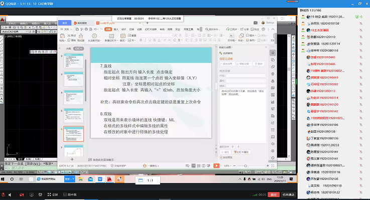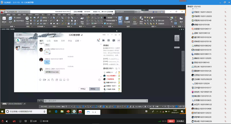 活动通过QQ群中的语音通话和屏幕分享的方式进行。19级城市地下空间工程2班的施政同学结合自己的PPT讲述了使用CAD软件进行二维制图的方法和技巧,18级土木工程1班余同乐同学一方面对前面的内容进行了自己的理解与补充,另一方面结合了即将开始的大学生结构设计竞赛,讲述了包括图层、定义块、双线、标注等与建筑制图和三维建模相关的内容。二位同学由基础出发,结合实际操作,以点带面,深入浅出。讲解结束后,同学们借助群聊对讲解过程中的问题进行了交流,两位同学也针对问题一一解答,受到了同学们的一致好评