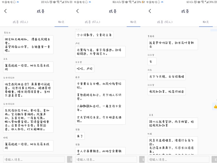 诗词大会题型多种多样,涉及范围很广,通过手写,拼读,绘画等等方式来作答,这极大地提高了同学们的兴致。主持人提问有关“相思”的诗句时,群聊中大家你一言我一语,分享了许多经典诗篇。如“锦瑟无端五十弦,一弦一柱思华年”,“愿君多采撷,此物最相思”等。北师大教授康震点评陶渊明“此中有真意,欲辩已忘言”时说到“这首诗对每个人来讲都有其真意,都能令我们感动”。中国古典诗词具有无限魅力,它是美好的,也是雅俗共赏的。杏花春雨江南,琴棋书画问雅,炊烟流水人家,渔樵耕种烟火。即使疫情阻挡了我们的返校之路,也不能阻止我们对诗词的热爱。只要内心有对诗词的热忱,就可以参与其中。