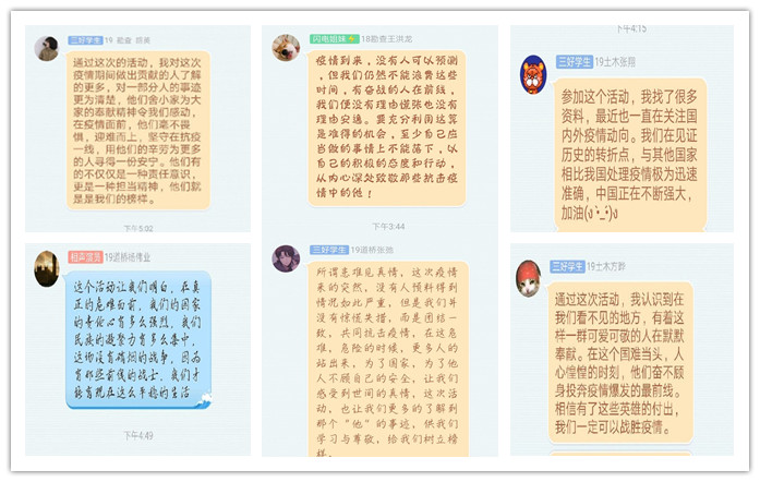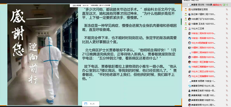 活动伊始,由18道桥一班王辰阳同学在比赛群内发起通话,参赛同学按照顺序依次分享屏幕,以PPT的形式为大家讲述抗击疫情同胞的感人事迹。这场比赛向大家介绍了许许多多平凡又伟大的人:有抗击疫情劳累过度,以身殉职的钟进杏医生;有身患渐冻症,却坚持与时间赛跑、与病毒斗争的院长张定宇;有舍小家顾大家、无私奉献的白衣战士何雯……最后,19安全一班的柏雨晴同学通过其动人的演讲、出色的PPT制作获得了本次比赛的一等奖。在举办完比赛后,许多观众也讲述了自己的感受,表达了自己对抗击疫情同胞的敬意。