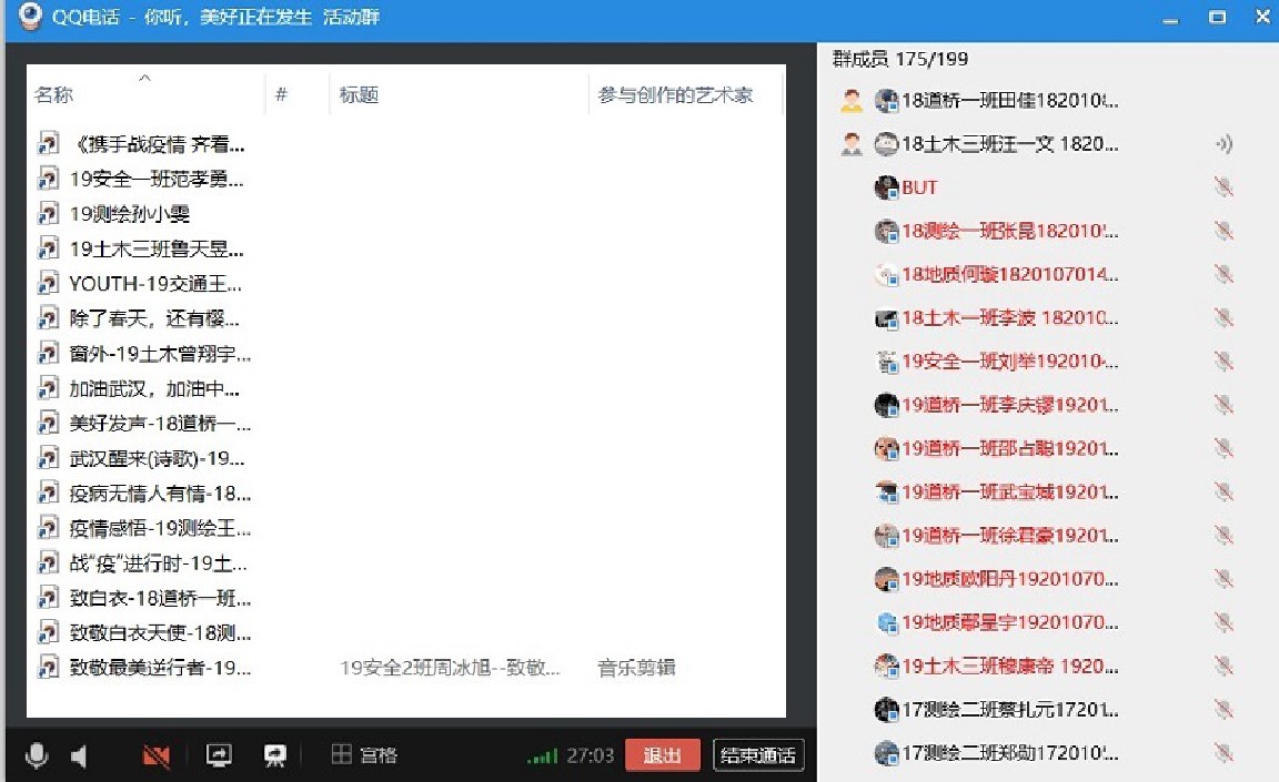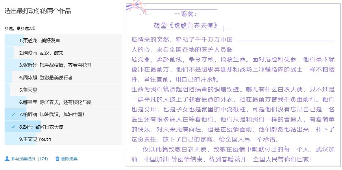 本次活动采取了线上收集音频的方式,自音频收集渠道开通以来,同学们积极参加。有的同学用慷慨激昂的演讲致敬最美逆行者;有的同学用意涵丰富的诗歌抒发对“武汉醒来”的美好期望;有的同学用优美凝练的散文展望了“除了春天,还有樱花与爱”的美好情景。经过初选,共有9个作品进入决赛,同学们仔细聆听选出了最打动人心的作品,最终18测绘专业的胡莹同学以她的作品《致敬白衣天使》获得了本次比赛的一等奖。
