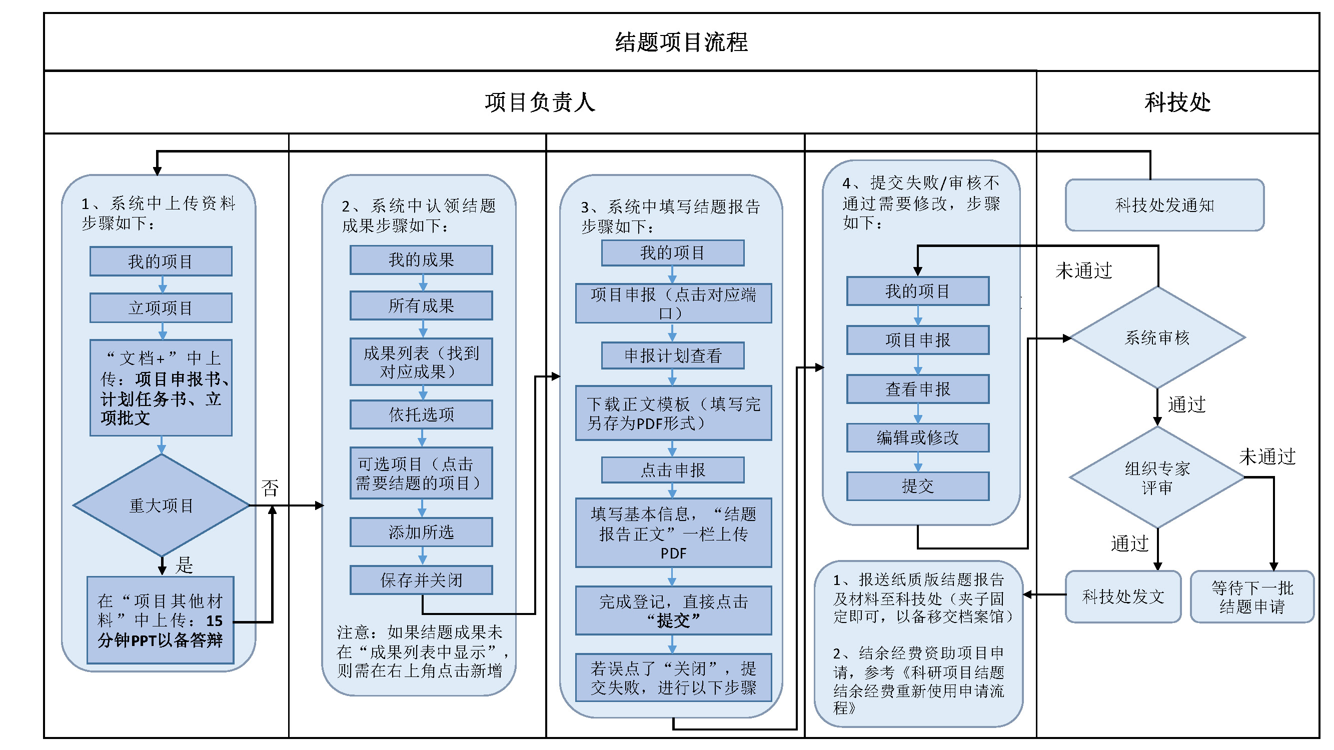 根据安徽省教育厅和学校关于科研项目管理的有关规定,学校计划于2020年12月初组织专家,对已到期应结题的教育厅高校科学研究重大、重点、一般项目以及校内其他各类纵向已到期或已达到相应结题条件的项目(由上级管理部门组织结题的项目除外),进行结题评审。具体工作安排如下: 一、拟申请结题项目的要求 1.申请结题项目应符合财务决算要求。即日起请附件中的项目负责人于11月17日前,通过财务系统自查结余经费,及时将借款进行冲账处理,且即日起至结题程序结束前不得发生财务支出; 2.应结题项目名单(附件1、2)中,未达到结题要求的项目,必须提交延期结题申请表;不符合财务决算要求的,视为结题不通过;延期仅限1次,期限为1年; 3.超期未结题项目名单(附件3、4)中,以下情况将进行撤项处理: (1)未进行本次结题申请; (2)未通过本次结题评审; (3)项目不符合财务决算要求。 二、结题申请流程 1.本年度结题申请均在学校科研管理系统中填写结题报告,结题报告中简表、项目衍生成果、经费预算、项目支出、结题材料附件(请先在“立项项目”文档中上传相应材料)均可通过系统自动抓取,只需项目负责人上传报告正文。系统申请请于2020年11月23日上午12:00前完成; 2.填写结题报告前,请项目负责人务必关注科技处首页-通知公告中,于2018年10月11日发布的《关于在科研管理信息系统中完善相关信息的通知》,完成相应成果的认领工作,否则在线结题报告将无法提取项目成果,影响最终结题(对于系统未抓取到的科研成果,请按系统提示进行新增,并绑定待结题项目编号); 3.纸质版结题报告(包含所有附件材料)和延期结题申请表,请于2020年12月2-4日,以学院为单位提交到科技处1804办公室(材料请勿装订,直接夹子固定即可,以便移交档案馆存档)。 三、结题成果认定说明 1.科研成果为论文时,必项是项目负责人或项目组成员完成,且包含结题项目编号; 2.科研成果为专利时,必须是项目负责人或项目组成员完成,且有专利证书(即专利申请、实审阶段均不能作为结题成果); 3.科研成果为软著或其他类科研成果时,必须有相关证明信息; 4.教育厅重大项目负责人准备15分钟ppt进行现场答辩,同时作为附件材料提交到“文档+”中,课题组全体成员参加,答辩时间另行通知。 联系人:自然科学科 仕敏;联系电话:63828063 社会科学科 任磊;联系电话:63828059