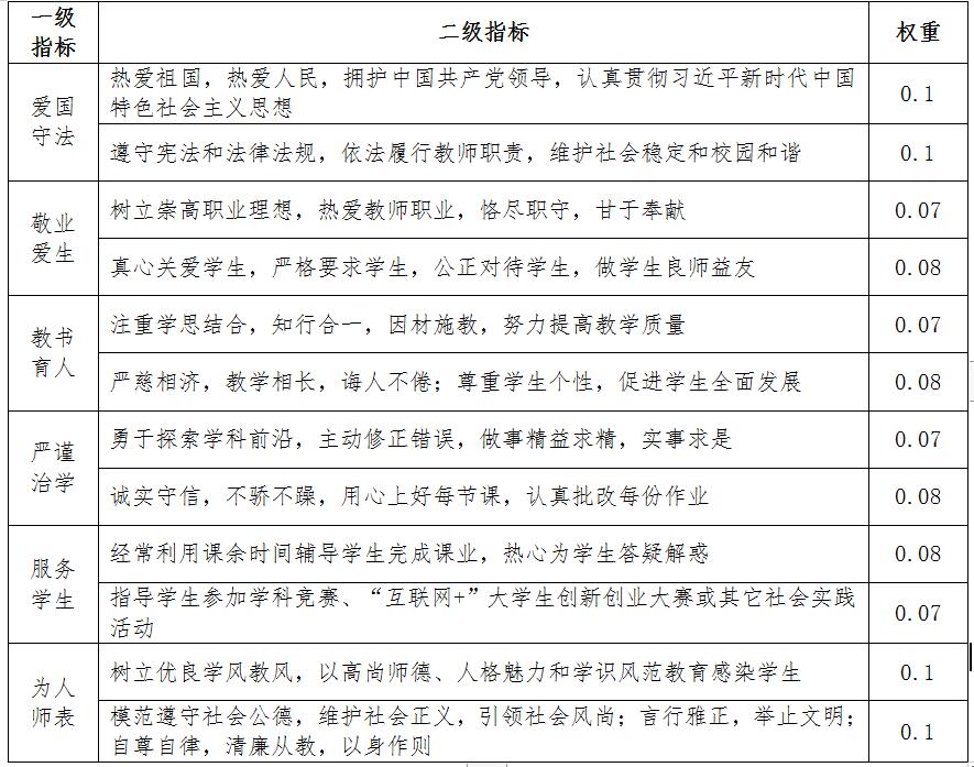 根据《教育部关于建立健全高校师德建设长效机制的意见》、《欧美黑人巨大videos精品_欧美黑人巨大xxxxx_欧美黑人乱大交_欧美黑人乱大交_欧美黑人牲交videossexeso_欧美黑人添添高潮a片www_欧美黑人添添高潮a片www_欧美黑人性暴力猛交喷水黑人巨大教师师德考核办法》等文件要求,学校每学期对教师师德进行考核,考核方式包括个人自评、学生测评、同事互评和单位考评。现结合学校实际,制定学生对教师师德状况评价(以下简称“学评德”)实施办法。 一、发挥学评德育人功能 高校教师的思想政治素质和道德情操直接影响大学生世界观、人生观、价值观的养成,决定人才培养质量,关系国家和民族的未来。学校利用学评德方式,促进教师提高职业道德水平,改进高校师德建设工作,加强对教师课堂教学过程有效监控,对落实好新时代立德树人根本任务,对培养知识、能力、素质协调发展的应用型、复合型、特色化人才,具有重大而深远的意义。 二、学评德主要内容 学评德内容设计以《高等学校教师职业道德规范》为指导,主要包括爱国守法、敬业爱生、教书育人、严谨治学、服务学生和为人师表六个方面,满分为100分,各占总分的比例分别为20%、15%、15%、15%、15%和20%。 三、学评德评价指标 学校学评德分为否决性指标评价和综合性指标评价两个方面。 1.学评德否决性指标评价 学校对教师师德考核实行“一票否决”。任何教师在教育教学过程中不得有下列8种情形:(1)损害国家利益,损害学生和学校合法权益的行为;(2)在教育教学活动中有违背党的路线方针政策的言行;(3)在科研工作中弄虚作假、抄袭剽窃、篡改侵吞他人学术成果、违规使用科研经费以及滥用学术资源和学术影响;(4)影响正常教育教学工作的兼职兼薪行为;(5)在招生、考试、学生推优、保研等工作中徇私舞弊;(6)索要或收受学生及家长的礼品、礼金、有价证券、支付凭证等财物;(7)对学生实施性骚扰或与学生发生不正当关系;(8)其它违反高校教师职业道德的行为。 在学评德过程中,学生首先要对师德否决性指标进行评价。当学生选择“有”上述任何一种情形且后来被学校调查证实的,则被评教师师德评分为0分;当学生选择“无”上述任何情形时,则被评教师师德测评分为学评德综合性评价得分。 2.学评德综合性指标评价 学评德综合性评价体系包括6项一级指标和12项二级指标。各项评价指标权重如下表所示。