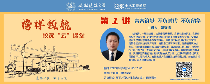 编者按:高山安可仰,徒此揖清芬。榜样是一种力量,润物无声;榜样是一面旗帜,指引方向。以榜样为鞭策强决心、聚动力,以榜样为参照明方向、循路径。为进一步缓解疫情带来的就业压力,拓宽育人渠道,教育引导学生开拓专业视野、树立正确的学习观、成才观和就业观,土木学院特推出“榜样领航·校友‘云’课堂”专栏,一月一主题,一月一分享,以网为媒,邀请优秀校友讲述奋斗故事、分享创业心得、分析就业形势、传授求职经验,让莘莘学子感受榜样力量,主动连接、自动对接,将榜样之力内化为立鸿鹄志、增爱国情、筑青春梦、做奋斗者的自觉行为,争做堪当民族复兴大任的时代新人!