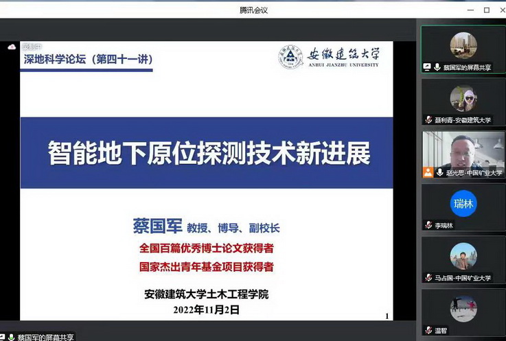 本网讯 11月2日下午,校党委常委、副校长蔡国军教授应邀为“深地科学论坛”作题为“智能地下原位探测技术新进展”的线上专题报告。本次论坛由深部岩土力学与地下工程国家重点实验室、中国矿业大学等单位主办,我校土木学院和安徽省智能地下探测技术研究院师生以及来自国内其他高校与科研院所的同行专家参会。