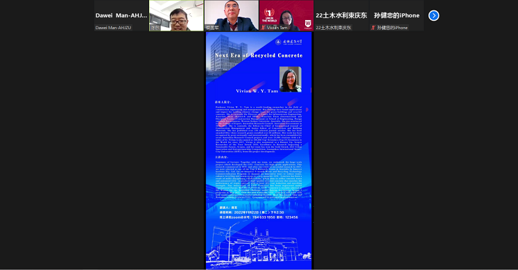 本网讯:11月22日下午,澳大利亚西悉尼大学Vivian W.Y.Tam教授应邀为土木学院师生作题为“Next Era of Recycled Concrete”的线上学术报告,本次报告会由土木学院主办。校党委常委、副校长蔡国军为报告会致辞,会议由土木学院副院长陈东主持,土木学院教师和研究生参加了报告会。