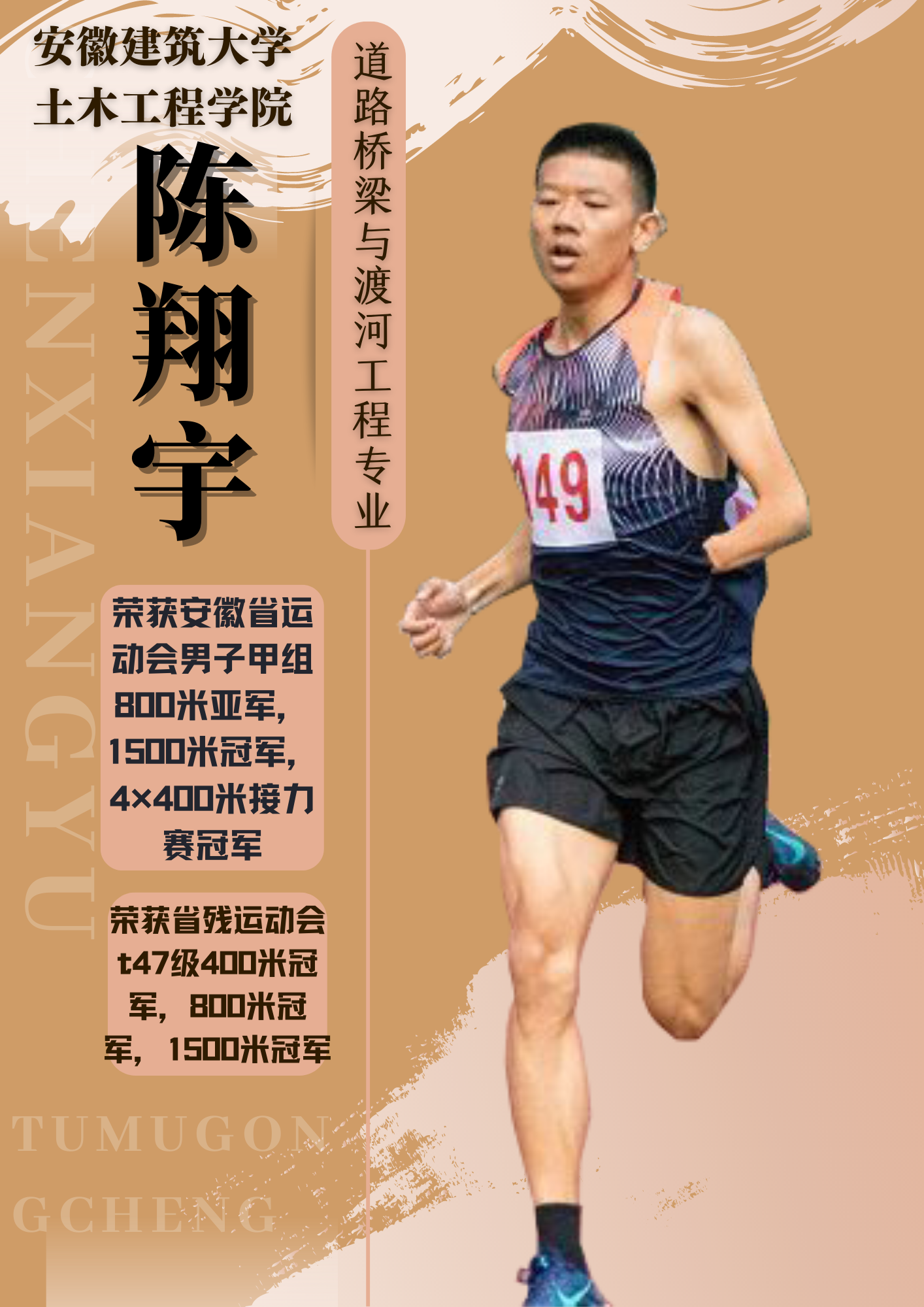 本网讯   喜讯,我校土木工程学院道路桥梁与渡河工程专业的陈翔宇同学在安徽第八届残疾人运动会上再创佳绩,获得t47级400,800以及1500三项冠军。在此之前,陈翔宇同学刚刚获得安徽省第十五届运动会高校部男子甲组1500冠军、4×400接力冠军800亚军。