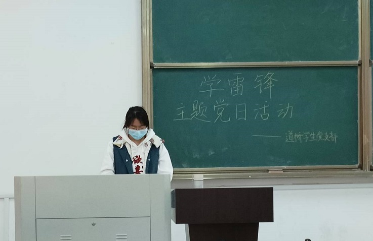 蒋琪同学介绍了展现雷锋精神的事迹,一件件动人的故事无不体现了雷锋精神的实质和内涵,全心全意为人民服务,为了人民的事业无限奋斗;束乔洁同学表示自己深深地被雷锋同志说的“人的生命是有限的,可是为人民服务是无限的,我要把有限的生命,投入到无限的为人民服务之中去”这句话影响着,她表示要以雷锋同志为榜样,弘扬雷锋精神,做一个对社会真正有用的人。党支部其他成员依次上台,或介绍雷锋事迹,或展现新时代榜样,或分享心得感悟,共同学习和传承着闪光的雷锋精神。