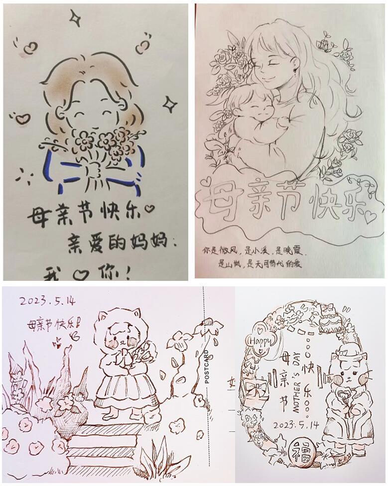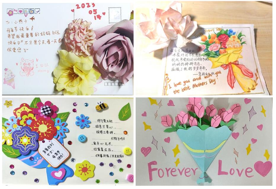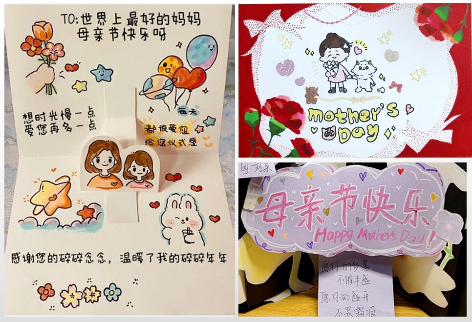 活动中,同学们最真诚的语言、最温情的画笔表达对母亲的感恩及祝福,并纷纷晒出自己制作“感恩母亲”贺卡。有的同学画出了成长过程中母亲对自己无私的爱与照顾;有的同学写下与母亲在一起的温暖瞬间;有的同学剪贴出一朵康乃馨祝福母亲永远年轻、健康。奚雨欣同学说:“母亲的碎碎念念,温暖了我的岁岁年年。”涂瑞超同学说:“爱没有方向,妈妈就是我的导航!”胡巧巧同学说:“愿母亲的岁暮不催风貌,愿母亲的盛开不畏霜凋。祝所有母亲节日快乐,幸福安康!最后,大家将贺卡以视频和快递的方式送给母亲。