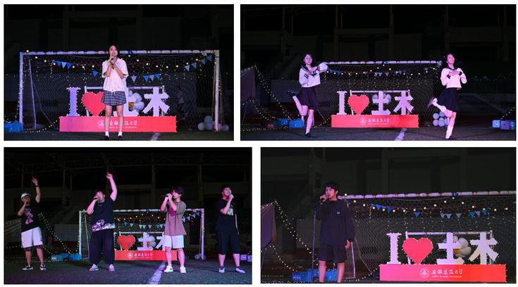 616日晚,土木学院2023届草坪毕业音乐在风雨操场举行。学院党政领导班子、毕业班辅导员、学生代表齐聚现场。落日西沉、晚星渐明,精心布置的现场灯光闪烁。观众们在轻快温馨的氛围中有序入场,每位观众都拿到一张始发站为土木工程学院、目的地去往光明的未来的“飞机票”,正面印有建大标志性建筑“徽弘门”,背面则是独具匠心的节目单,为晚会增添了一份仪式感。