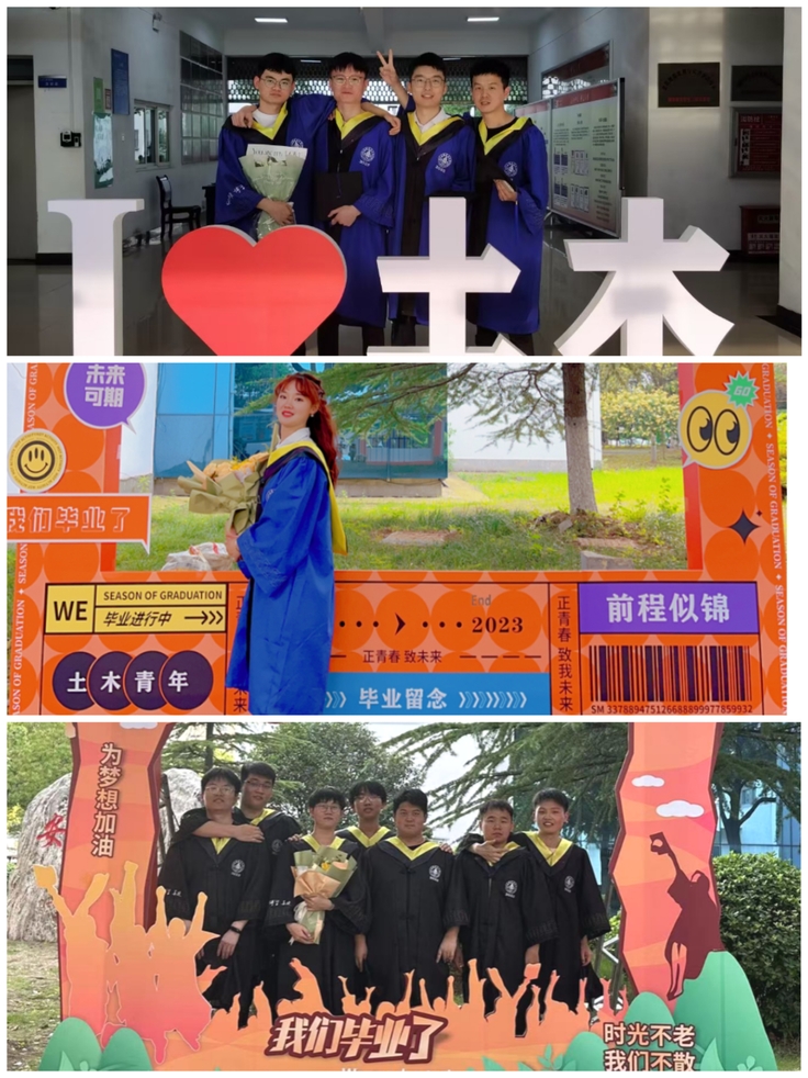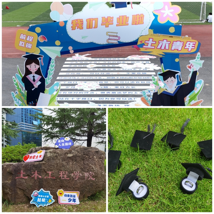 几载春秋寒暑,九月桥边、易海湖畔、逸夫楼中、土木石前,一张张毕业留念,一帧帧青春美好。学院为毕业生搭建了“我爱土木”、“绽放青春”、“前程似锦”、“青春不散场”等毕业留念展架,制作了“C位毕业”、“土木学子 追光逐梦”、“最好的我们”等毕业手持牌,定制了印有学院名称的毕业纪念戒指。毕业生们通过写贺卡、送花、合影等形式,向老师和同学表达不舍与感谢。