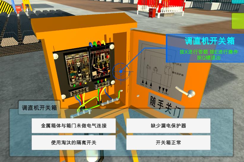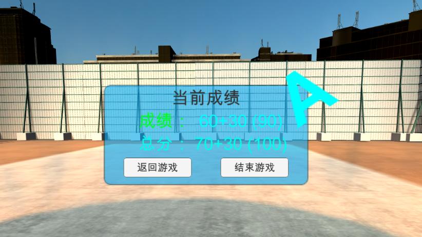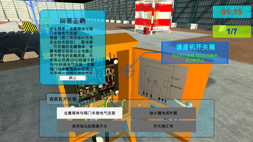 图3实际成绩单UI样式 虚拟实验步骤虚拟实验开始包含两个UI界面,一个为包含了开始虚拟实验按钮的界面,另一个用来提示操作者按键的操作的指南界面,操作者在点击开始虚拟实验后将会弹出操作指南界面,在该界面点击确认后正式进入虚拟实验。在建筑工地的大门外,操作者必须通过佩戴正确的安全帽。在靠近大门时会亮起灯光并给出提示。进入大门后,走进蓝色光圈开始虚拟实验的主要部分。 虚拟实验主要部分即为操作者对场景中特定的设备或物品进行检查并进行答题,过程是随机的,无论操作者先进行哪一个物体的检查都可以。在进入区域后,靠近目标物体将会显示该物体的名称。此时按照提示可以进行两种按键操作,一是按下E键,将会弹出有关该物体的所有操作,比如配电箱的开关门等,这些操作有些是文字提示,有些是具体的物体操纵,可以使操作者更好地看到安全隐患的位置;另外一个便是按下X键后,将会弹出答题界面,操作者选择答案即点击按钮后,解释UI界面弹出,评判操作者答案是否正确,显示出正确答案并给出解释说明。 当操作者完成所有的检查后,可以通过走进棕色光圈,这时将会弹出结束界面,可以重新开始虚拟实验或者回到当前虚拟实验。为了提高虚拟实验的可玩性,其中每一个设备或物品都有多种状态,在虚拟实验开始时已经随机生成了其中一种状态。 在每一次操作者选择答案后,都会记录下他的正误,在进入光圈后将会给出其对应的成绩单,成绩单分为两个部分,一是通过操作者的答题正确率形成的成绩,另一部分是由剩余时间所形成的成绩。答题所能取得的成绩为70分,如果完成任务时剩余时间还剩下60%以上,则可以得到30分。如果在设定的6分钟的时间内完成虚拟实验,则可以通过光圈离开虚拟实验,此时可以点击“返回虚拟实验”重新回到虚拟实验继续未完成的任务;而如果剩余时间归零,而操作者还没能完成任务通过光圈离开虚拟实验,则会弹出结束界面,此时回到虚拟实验的按钮变灰。操作者只能通过点击“结束虚拟实验”。点击后可以重加载场景,生成一个新虚拟实验。 |
