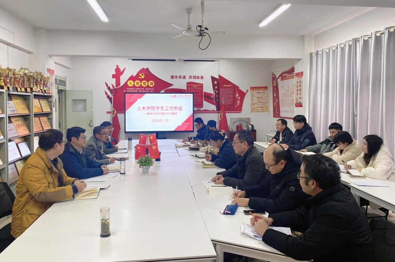 本网讯  为扎实做好期末学生工作,进一步总结凝炼、规划发展、统筹推进,努力做到“重点工作求突破,特色工作求提升,常规工作求精细”,1月15日,土木学院在徽匠楼1306会议室召开一月份学生工作例会,主要对2023年学生工作进行总结交流并部署2024年工作安排,学院领导班子、全体专兼职辅导员共同参会,会议由学院党委副书记马智鑫主持。