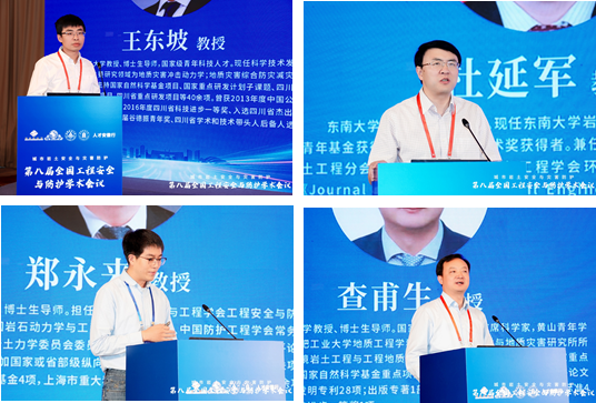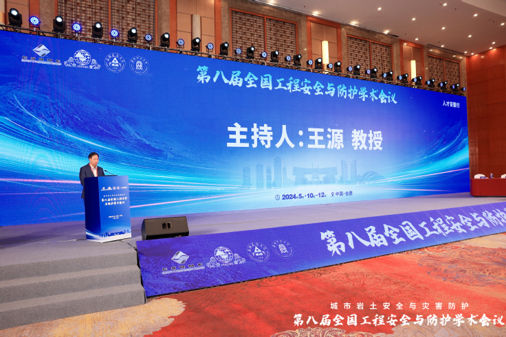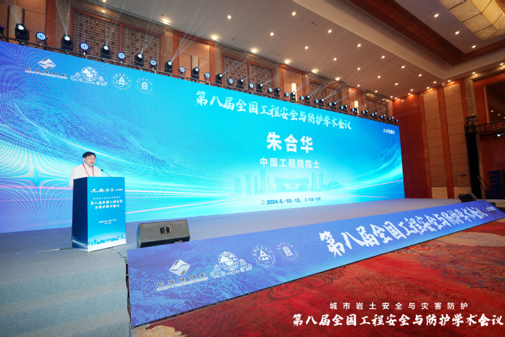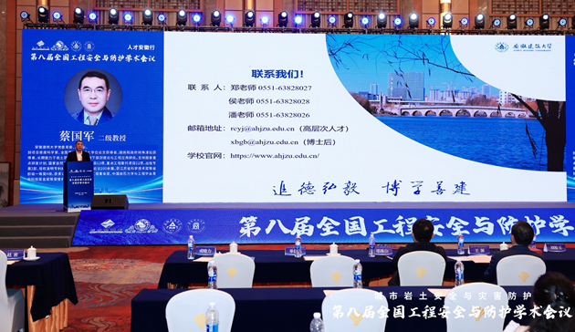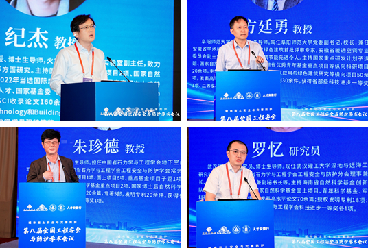 大会特邀报告环节由同济大学朱合华院士、北京建筑大学戚承志教授、南京大学施斌教授、南京理工大学何勇教授、中国科学技术大学纪杰教授、阜阳师范大学方廷勇教授、河海大学朱珍德教授和武汉大学罗忆研究员分别做题为为:“智慧基础设施数字底座建设及其实践”、“颗粒介质受载力链演化的力学模型”、“岩土体灾变感知与应用”、“新型爆炸毁伤与韧性防护技术”、“隧道火灾烟气流动特性及控制方法”、“城乡建设安全发展“安徽模式””、“极端环境下干热岩体渗流网生成智能演化理论研究”与“复杂应力路径下双江口花岗岩破坏特征及能量演化机制”的大会报告。