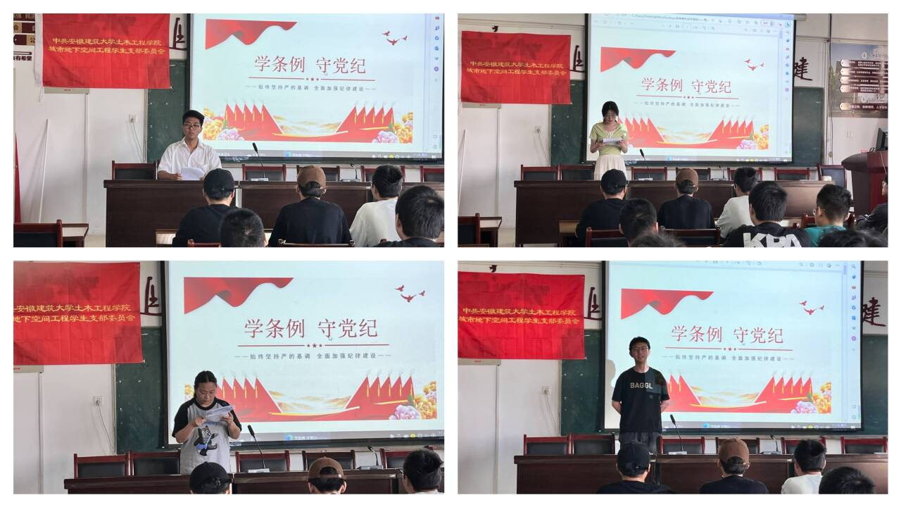 本网讯 为进一步深入学习贯彻习近平总书记关于党纪学习教育的重要讲话重要指示精神,推动党纪学习教育在学生党员中扎实开展,教育引导学生党员强化纪律意识,不断增强学生党员的责任感、使命感和担当意识,5月16日,土木工程学院党委副书记、执行院长张宁为城市地下空间工程学生党支部全体党员讲授“学条例 守党纪”——党纪学习教育专题党课。