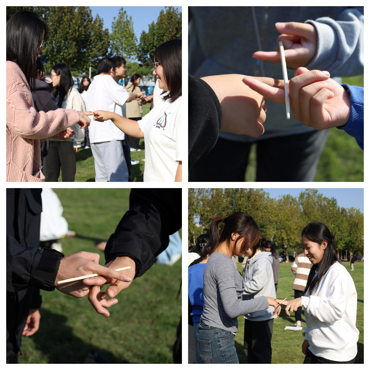 两位参与者组成一组,各伸出一根食指,指腹向下支起一根筷子,不可以语言交流。根据主持人指令行动(如蹲下、转圈等等),筷子掉落即为淘汰,坚持到最后的一组玩家可获得奖励。