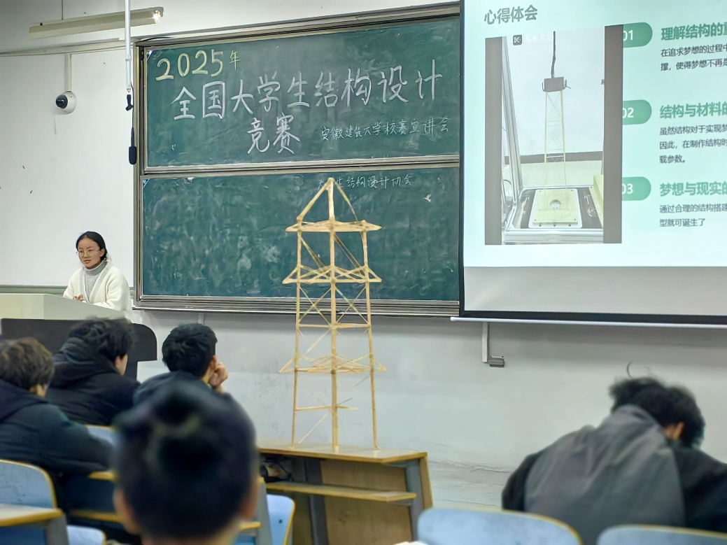 土木工程学院双创中心主任、指导教师康小方向同学们介绍了2025年全国大学生结构设计竞赛的相关准备工作。主要详细解释了竞赛的背景、意义、赛制、参赛要求以及评审标准,强调了结构设计在工程领域的重要性,让同学们对竞赛有了更深入的了解,帮助同学们更好地准备和参与竞赛。 本次宣讲会为同学们提供了一个和全国大学生结构设计竞赛一等奖参赛队员学习的机会。与会学生就相关关注的问题与一等奖代表队师生进行咨询,纷纷表示将以学长学姐的结构赛经验为借鉴,努力提升自己的设计能力和团队合作精神,为2025年全国大学生结构设计竞赛做好准备;也希望通过更多地参与学科竞赛等活动,也希望自己能为学校、学院争光。 全国大学生结构设计竞赛是教育部和财政部联合发文批准的9个首批全国大学生学科竞赛资助项目之一,比赛以创造、协作、实践为宗旨,是土木建筑工程领域级别最高、规模最大的学生创新竞赛,因赛题难度大、挑战性强、含金量高等特点,被誉为“土木建筑皇冠上璀璨的明珠”。近年来,赛事高度契合工程实际,聚焦创新工程教育,瞄准工程行业前沿,充分考查学生的理论知识储备、空间受力分析能力、创新能力和工程实践能力,对培养拔尖创新人才起到了积极示范作用。(文/图:殷曦、江学琴、刘得鑫、康小方;一审:叶训;二审:施国栋;三审:王媛)  |