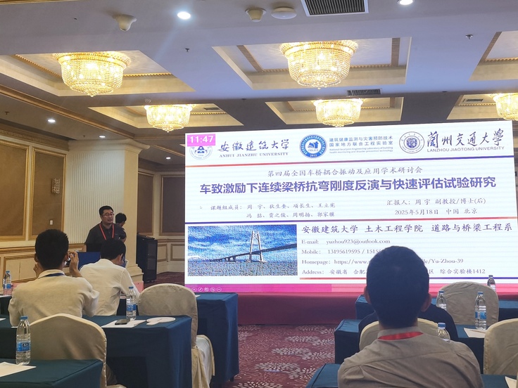 土木学院道桥系周宇副教授应邀做题为“车致激励下连续梁桥抗弯刚度反演与快速评估实验研究”的学术报告,卢恋博士做题为“基于分数阶Fourier变换的移动荷载激励下桥梁损伤识别研究”的学术报告,两个报告展示了土木学院在车桥耦合理论及应用领域的前沿探索,得到了与会专家学者的广泛关注。
