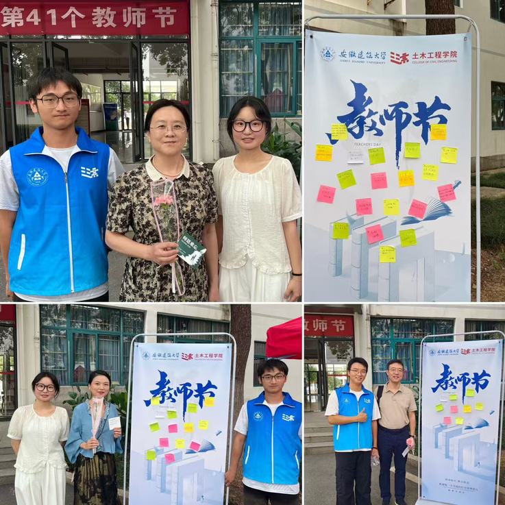 本网讯 为弘扬尊师重教传统,表达对教师的感恩之情,910日教师节当天,土木学院在徽匠楼前举办“师恩如海,感恩同行”主题活动。同学们通过暖心海报、手写贺卡、鲜花祝福和师生互动留言等形式,向辛勤耕耘的老师们致以节日的问候与诚挚的感谢。