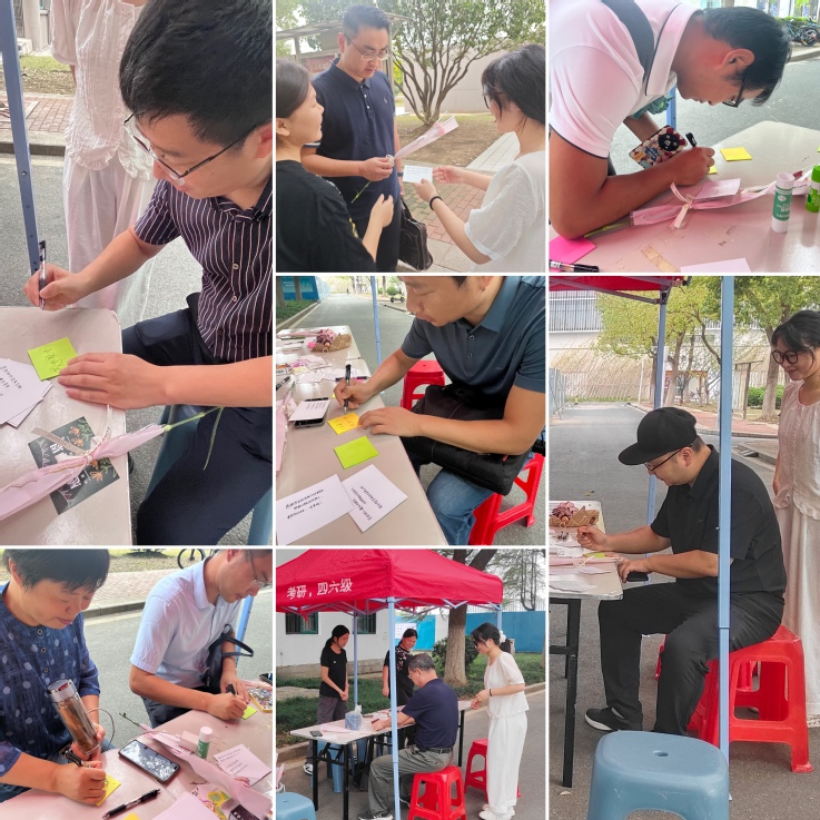 活动现场暖意融融,徽匠楼前一面巨型海报墙格外醒目——这面精心设计的海报,不仅以细腻的画面与文字凝练着同学们对师长的感恩之情,更以庄重而温馨的氛围,为校园增添了浓厚的节日气息。现场,同学们手捧娇艳鲜花、怀揣亲笔书写的贺卡,有序走向老师:贺卡上,“您的声音满是力量,您的眼神里全是信任,祝您教师节快乐!”“课堂上的每一个知识点,都是您为我们点亮的星光”等真挚话语,字里行间满是对老师的敬爱与祝福。收到这份“专属惊喜”的老师们难掩感动,纷纷拿起笔在便利贴上写下对学生的期许:“不是我在最好的时光遇见了你们,而是遇见了你们,才成就了我后来最好的时光”“愿你们在求学路上,既能仰望星空、逐梦远方,也能脚踏实地、笃行不怠,以勇气与善良遇见更多美好”…… 同学们小心翼翼地收集起这些暖心寄语,一一张贴在海报墙上,一面承载着“师者期许”与 “学子感恩”的“师生寄语墙”就此落成,成为现场最动人的风景。