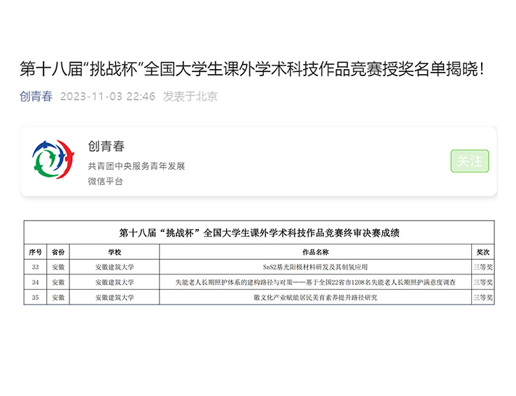 本届“挑战杯”共吸引全国2000多所高校、40余万件作品、250多万名学生参赛。我校自2022年4月启动“挑战杯”大学生课外学术科技作品竞赛以来,首办挑战杯“青苗”训练营,深入学院举办二十余场专家指导会,二十余场训练营交流沙龙,优化选题合理组队,并组织项目成员赴中科院、社科院交流学习,最终经过专家评审、院校两级选拔推荐作品参加省赛,获得省级一等奖七项。其中,材化学院的《SnS2基光阳极材料研发及其制氢应用》、公管学院的《失能老人长期照护体系的建构路径与对策一一基于全国22省市1208名失能老人长期照护满意度调查》以及《徽文化产业赋能居民美育素养提升路径研究》晋级国赛,荣获主体赛国家级三等奖。