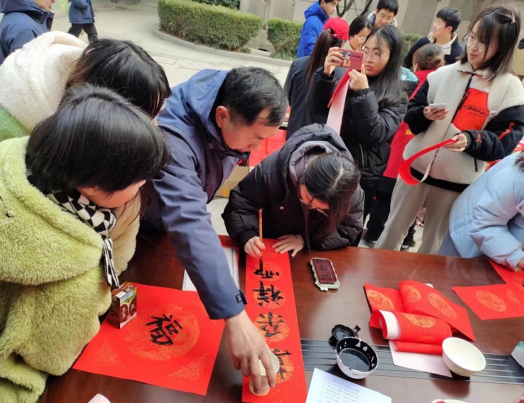 一墨一砚一宣纸,一字一句一名言,书法用自己的方式传承着中华传统文化的独特魅力,北区在活动现场摆上办公桌,准备好笔墨纸砚,同学们在现场挥毫泼墨,写下了一副副春联,毛笔起起落落挥洒出青春的风采,火红的纸张在老师和同学们的字字句句中有了神韵。“龙年吉祥喜事来 建筑大学育人才”“百鸟啼转万树花 九龙飞舞千秋雪”、“迎新年百福呈祥 辞旧岁家业兴旺”……一句句喜庆吉祥的祝福被写在洒金红纸上,展现出对幸福生活的追求与祝福,也有平安吉祥、和谐发展的美好寓意。