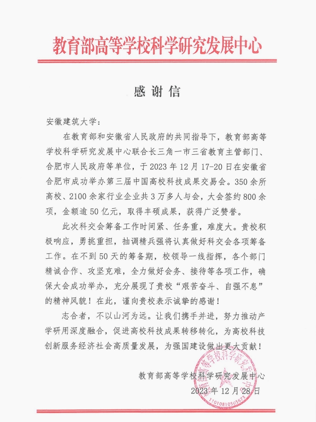 本网讯  近日,我校收到教育部高等学校科学研究发展中心发来的感谢信,对学校在第三届(2023)中国高校科技成果交易会筹备工作的突出贡献致以诚挚感谢。