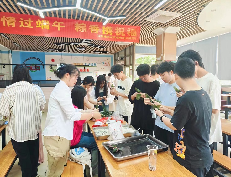 65日至7日,学校食堂开展包粽子活动,工作人员提前为同学们准备了制作粽子的所需材料,并现场讲解包粽子技巧。同学们三五成群,围在桌前相互指导和学习,一片片粽叶、一粒粒糯米,很快就在同学们的欢声笑语中变成一个个粽子,粽子形状各异,有的松松散散,有的过于紧实,虽然形态各异,但都包裹着节日的美好祝福。同学们在欢声笑语中收获全新技能,体验传统文化的独特魅力和节日的浓厚氛围。
