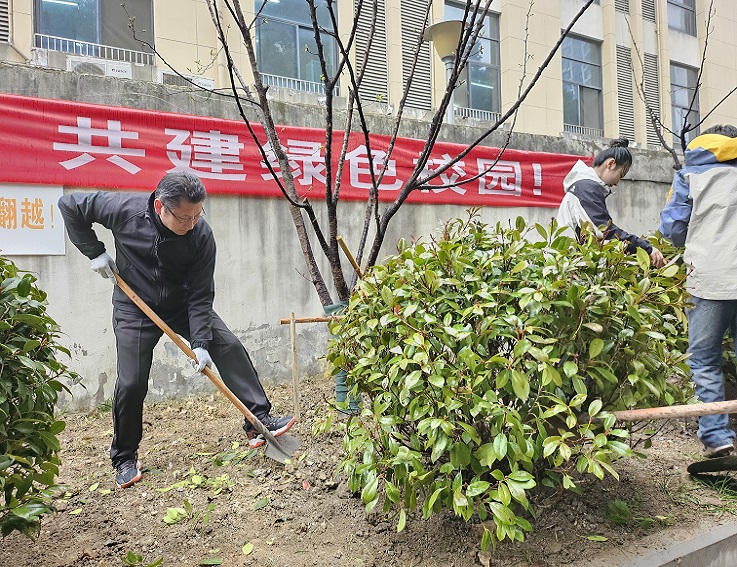 尽管天空飘着细雨,但大家的热情丝毫未减。马文革和黄显怀率先拿起铁锹,与师生们一起挥锹铲土、扶苗填坑、浇水培土,每一道工序都做得认真细致。马文革强调,植树造林是功在当代、利在千秋的事业,希望通过此次活动进一步提高广大师生共建共享生态校园的意识,让绿色成为校园的底色。