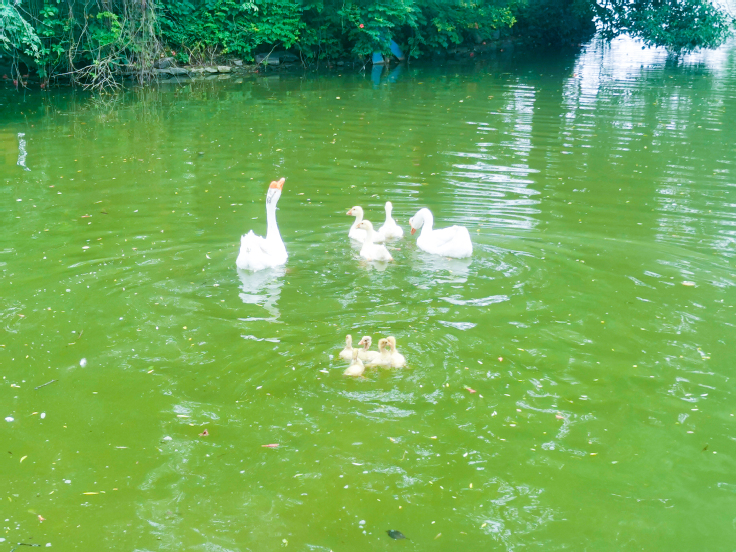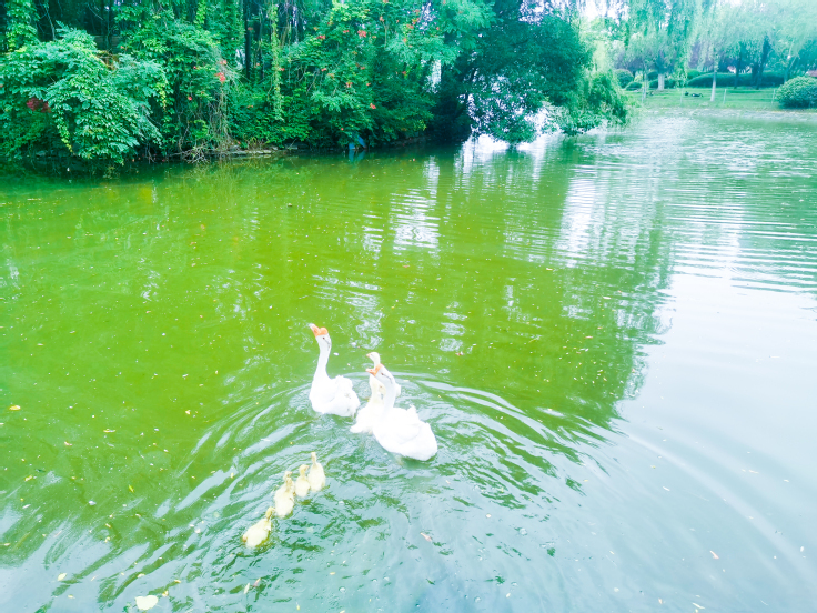 雨后初晴,惠风和畅。在“鹅爸鹅妈”的带领下,大白鹅一家来到湖边遛弯,悠然自得、其乐融融。