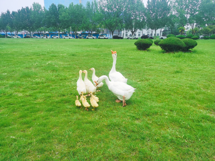 走在最前的白鹅宝宝出生刚刚“十天”,摇摇晃晃,走路还不太稳。紧跟其后的“哥哥姐姐”们其实也刚刚满月。但在学校养护人员的悉心照顾下,现在已经褪去淡黄色的绒毛,换上了标志性的优雅“白礼服”。