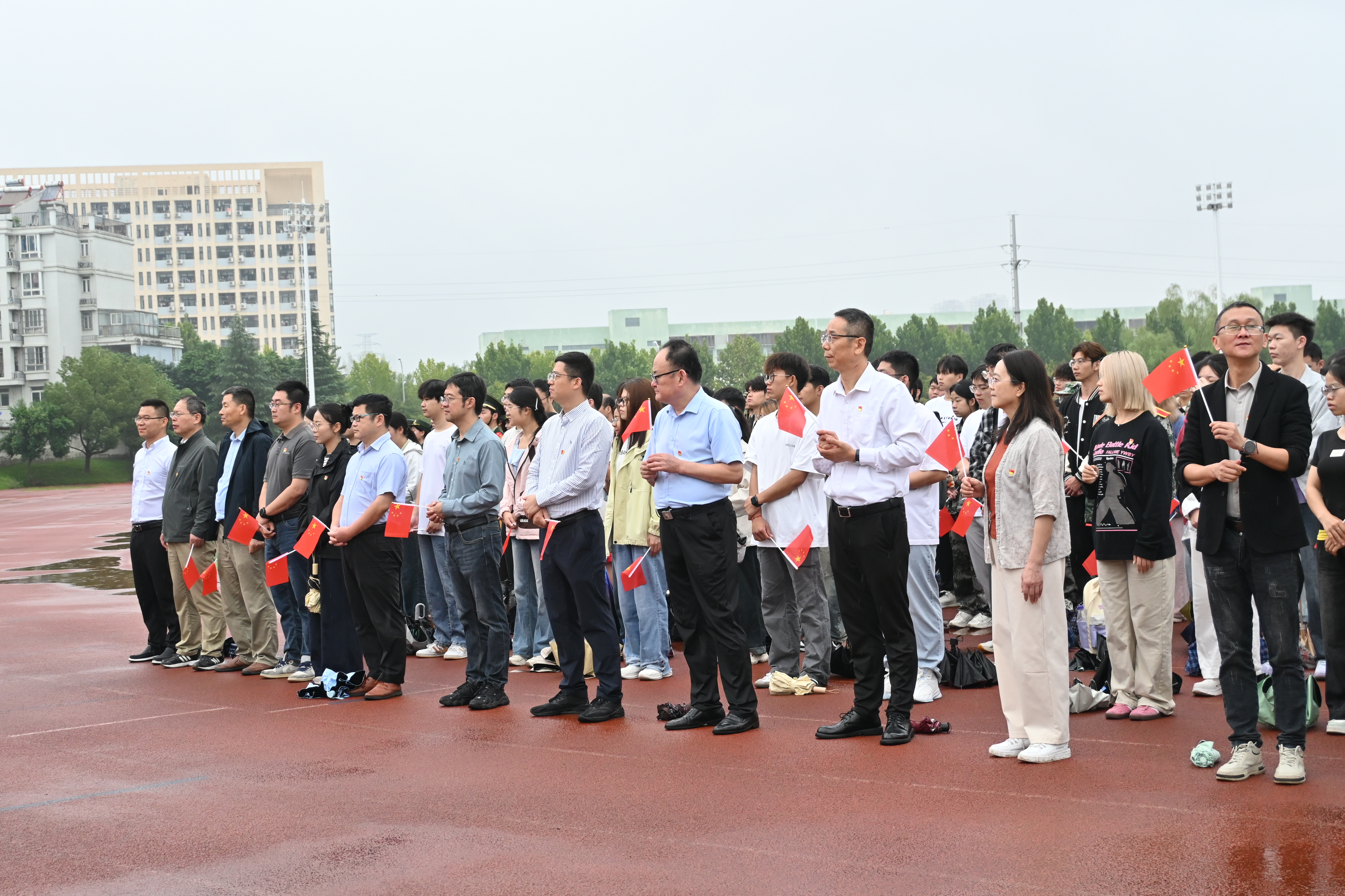 清晨7时20分,细雨中的田径场洋溢着“爱党爱国爱校”的浓厚氛围,师生们整齐列队、精神饱满,静静等候仪式开启。7时30分,校团委国旗班成员组成护旗方队,迈着铿锵有力的正步从田径场东侧入场,身姿挺拔、目光坚定,每一步都彰显建大学子的昂扬风貌,护送五星红旗缓缓走向升旗台。