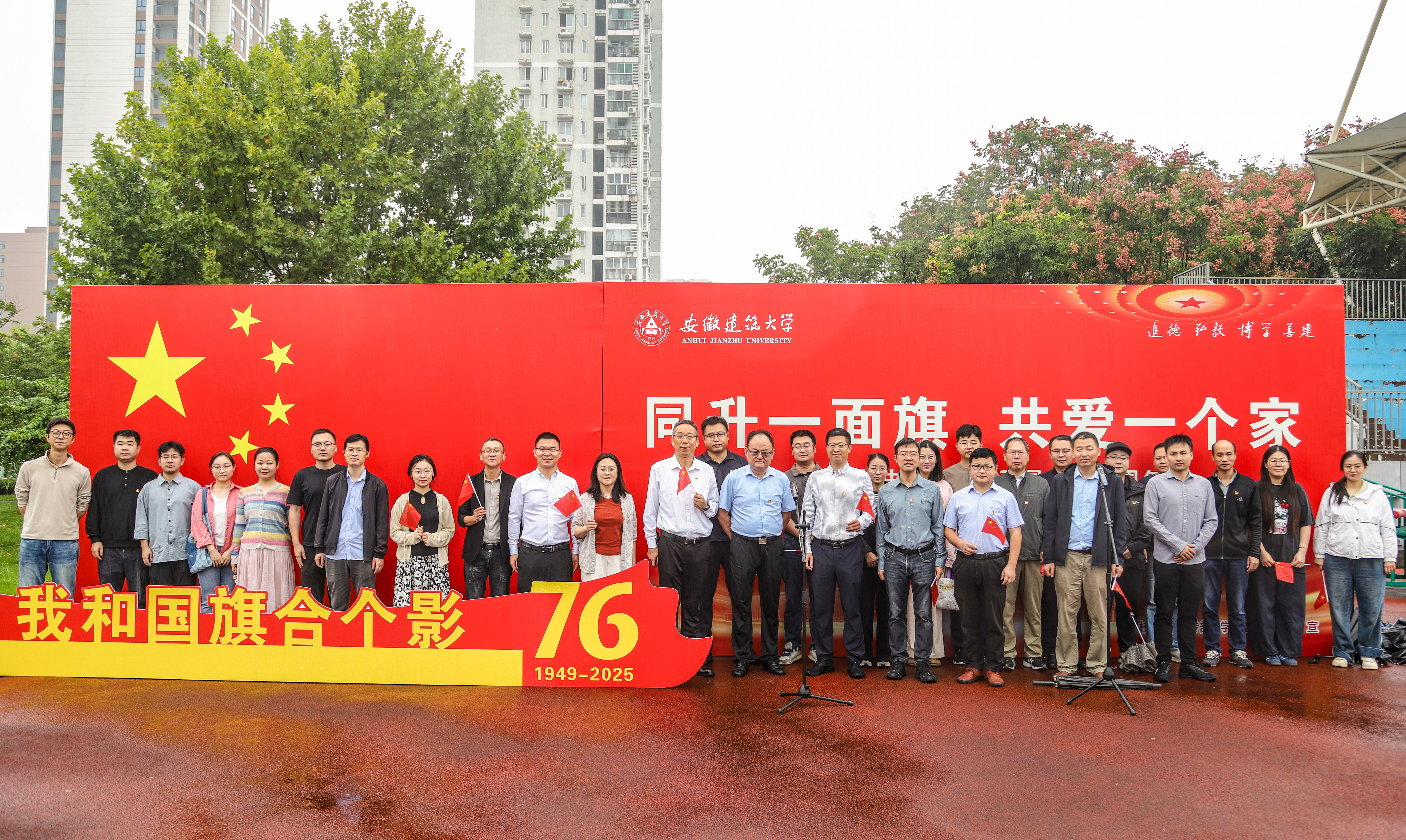 “我和国旗合个影・我为建大添光彩”主题活动温馨开启,师生们有序走到国旗杆下,或单人定格初心,或班级、院系集体合影,用镜头记录与国旗相伴的美好瞬间,与祖国母亲共庆华诞。这一互动环节既是对“五进”升旗活动育人理念的延伸,让国旗元素融入师生日常,也让爱国主义教育从庄严仪式转向温馨互动,进一步拉近师生与国旗、与祖国的情感距离,凝聚起师生同心向国、共筑梦想的奋进力量。
