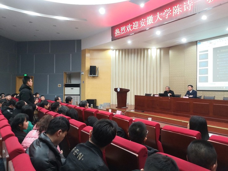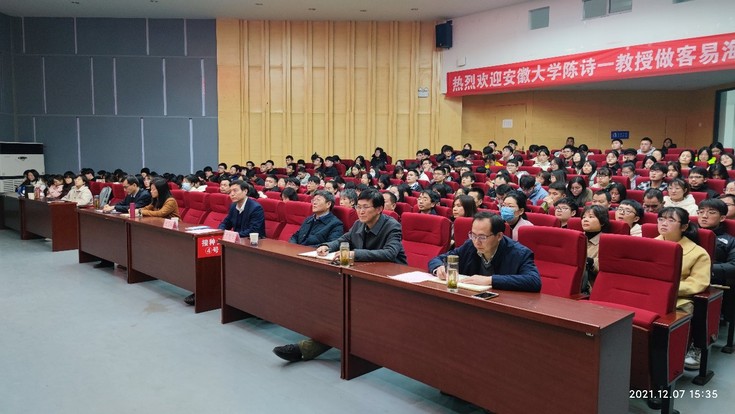 本网讯  12月7日,安徽大学党委副书记、常务副校长陈诗一教授做客易海大讲堂,在北区图书馆二楼报告厅以后疫情时代我国经济转型发展分析为题,为师生带来一场精彩报告。党委副书记、校长黄显怀主持报告会。校督导员方潜生出席报告会,经管学院240余名师生聆听报告。
