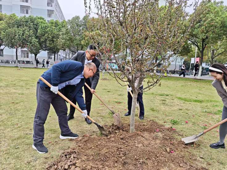 植树现场,党员们分工协作,挥锹铲土、扶苗填坑、培土浇水,干劲十足。经过大家的辛勤劳作,栽种的10棵海棠树在校园里安家落户,每一棵树苗不仅寄托着大家对绿色校园的美好期望,也为校园增添了一抹新绿。