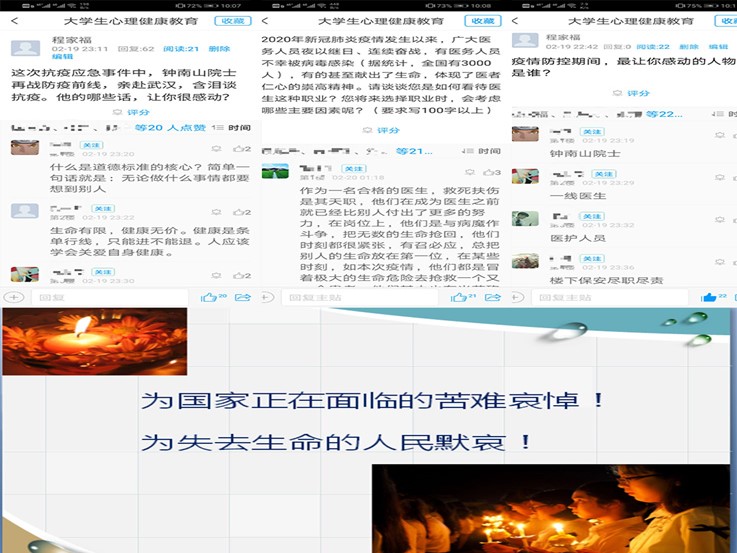 疫情期间,学生们通过新闻报道看到了许多信息,在心理健康教育课上,老师引导学生关注积极信息,关注抗击疫情中感动的人和事,学习奋战在抗击疫情一线的医护人员的无私奉献精神,进而思考生命的意义与价值。