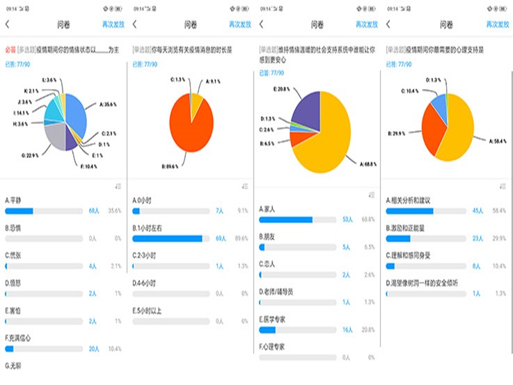 课程组老师在学习通上对上课学生进行问卷调查,从学生疫情期间的情绪状态,每天关注疫情信息的时长,社会支持系统是否完善,需要的支持系统等方面了解学生的实际心理状态,进而为上好本校学生的心理健康第一课获得数据支持。