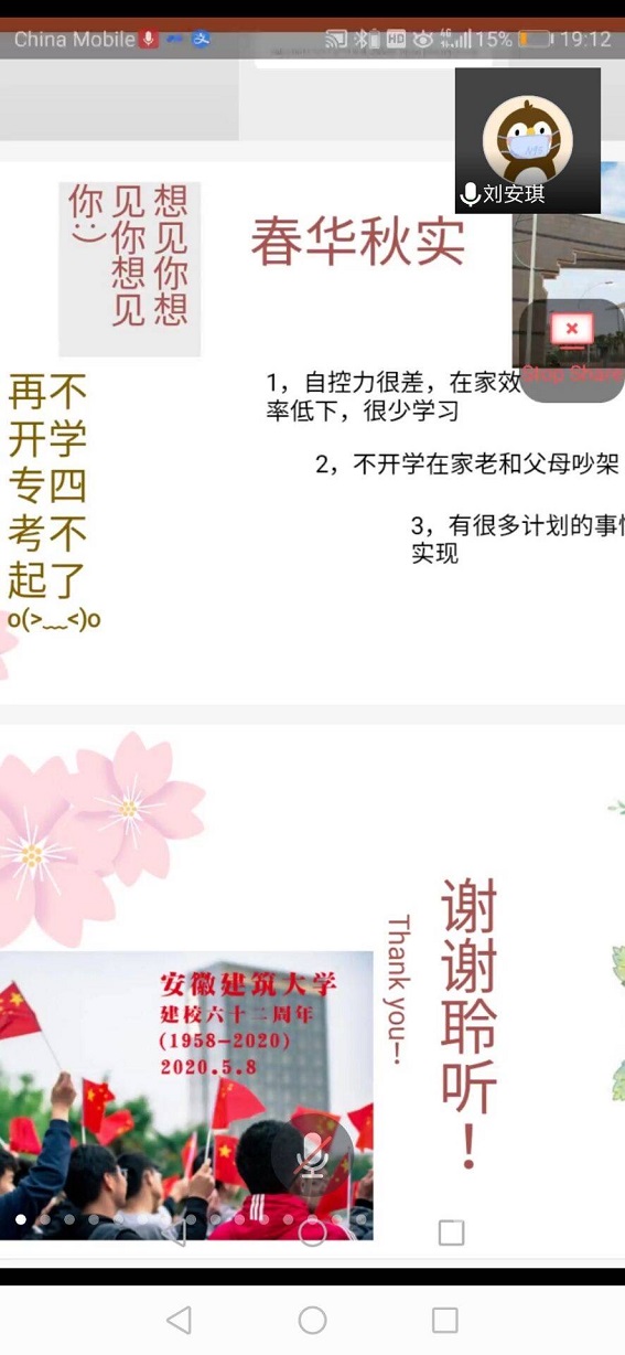 主持人介绍了本次活动的意义,活动负责人共享主题材料后分别通过分享居家心理变化”、“在线排忧解难”和“与更好的我同行”三个板块展开本次活动参与活动的同学先后倾诉了居家期间遇到的心理不适以及担心与同学老师的相处问题;辅导员在线普及心理健康知识,观看心理健康视频,分享了自己的居家心理调整方法,帮助同学们进一步认识自我,正视心理问题,在欢声笑语中同学们敞开心扉,增进彼此间的沟通与交流,建立和谐的人际关系。