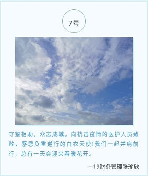 本网讯 为加强疫情防控期间大学生的心理健康教育工作,培养学生积极向上的心态,作为校心理健康月的活动之一,近日经管学院线上开展了“疫”路同行,“心”之所绘心灵寄语活动。