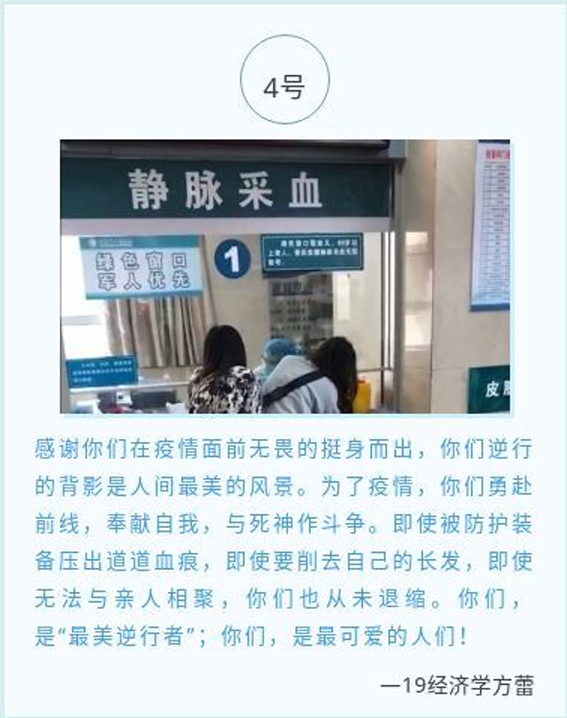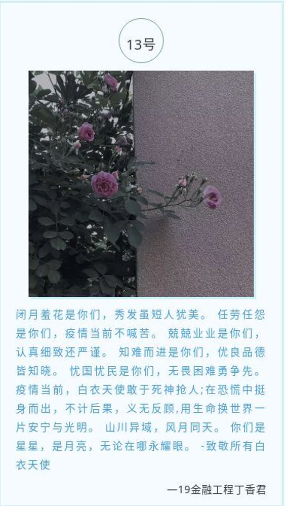同学们积极参加,用语言表达对广大医护人员的感谢与敬佩并用相机记录下疫情期间那些温暖的瞬间,描绘出白衣天使的巨大贡献与无私,表达了对于他们的敬意。“在恐慌中挺身而出,不计后果,义无反顾,用生命换世界一片安宁与光明”是对奋战一线的白衣天使们最完美的写照。
