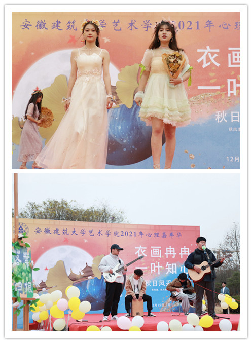同学们通过具有专业特色的活动传递生活中的美好,展现青春风采,追逐梦想。艺术学院于举办的“衣画冉冉,一叶知心”心理嘉年华秋日风采主题秀,依靠着自己的奇思妙想,制作了一件件别出心裁的落叶饰品与秋日羽衣,展示出艺术学院学生的想象力和动手能力,现场跳跃的音符演绎青春的活力,动人的舞步展示青春的风采,传递出对美好校园生活的热爱。