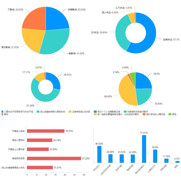 本次活动,学院心理工作站面向学生开展《疫情之下学生心理状态》线上问卷调查活动,共收回有效问卷数据432份。通过数据分析反映出学生对全国每天疫情发展态势关注度不高,毕业班学生因疫情导致线下就业机会减少,产生找工作焦虑,根据疫情防控要求,学校加强校园大门管理,学生自由活动空间减少,出现了急躁焦虑现象。本次活动围绕疫情期间学生可能出现的心理焦虑、恐慌、多疑、沟通困惑等心理问题,心理工作站老师深入浅出地向同学们讲解疫情期间产生的负面情绪形式、正确认识负面情绪的重要性以及心理调适方法,正确识别自己的情绪、接纳情绪和培养快乐情绪等,并对如何缓解心理压力提出了一系列方法与措施。