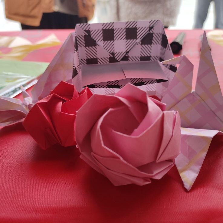 12月12日,在北区食堂门口开展了“不忘童心,手作快乐”冬季折纸活动暨心理嘉年华开幕式。一张张彩纸,折叠出精美图样;一双双巧手,勾勒出童年回忆。同学们在活动中释放疲惫,丢掉烦恼,舒缓心情,感受到童心的纯真与美好。丰富多样的折纸作品,也展现了学生们丰富的想象力和创造力。
