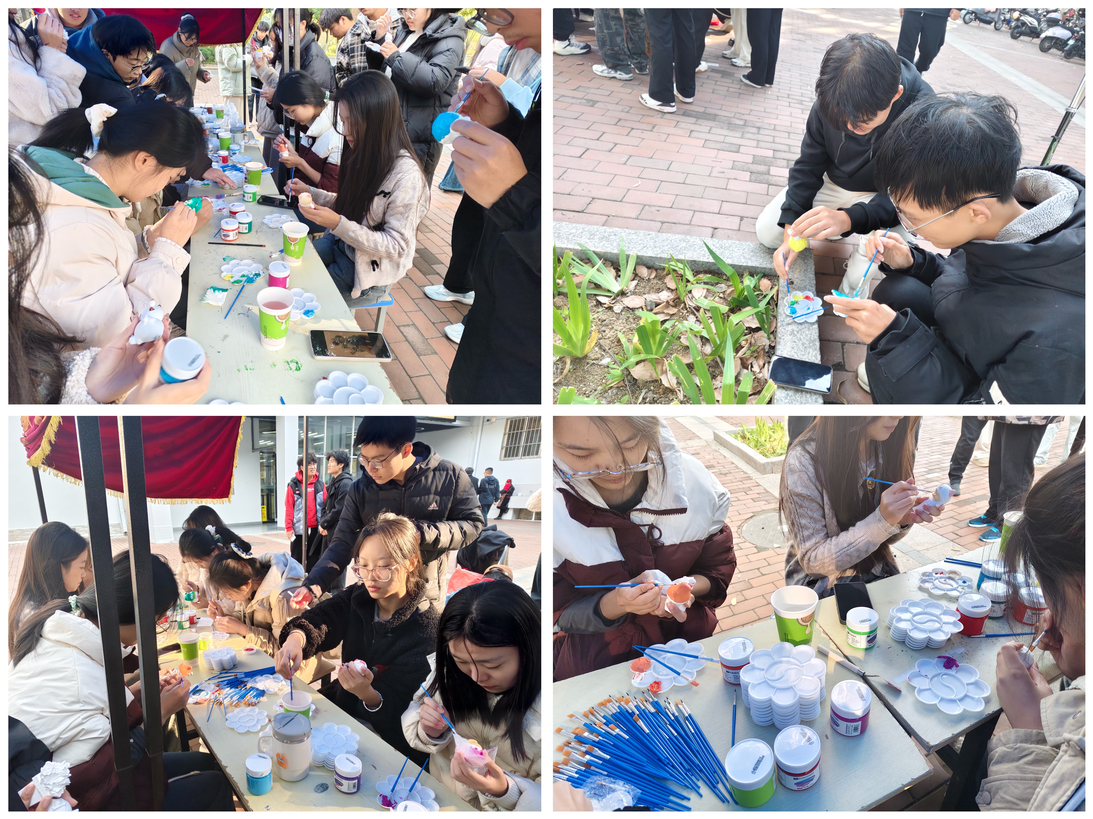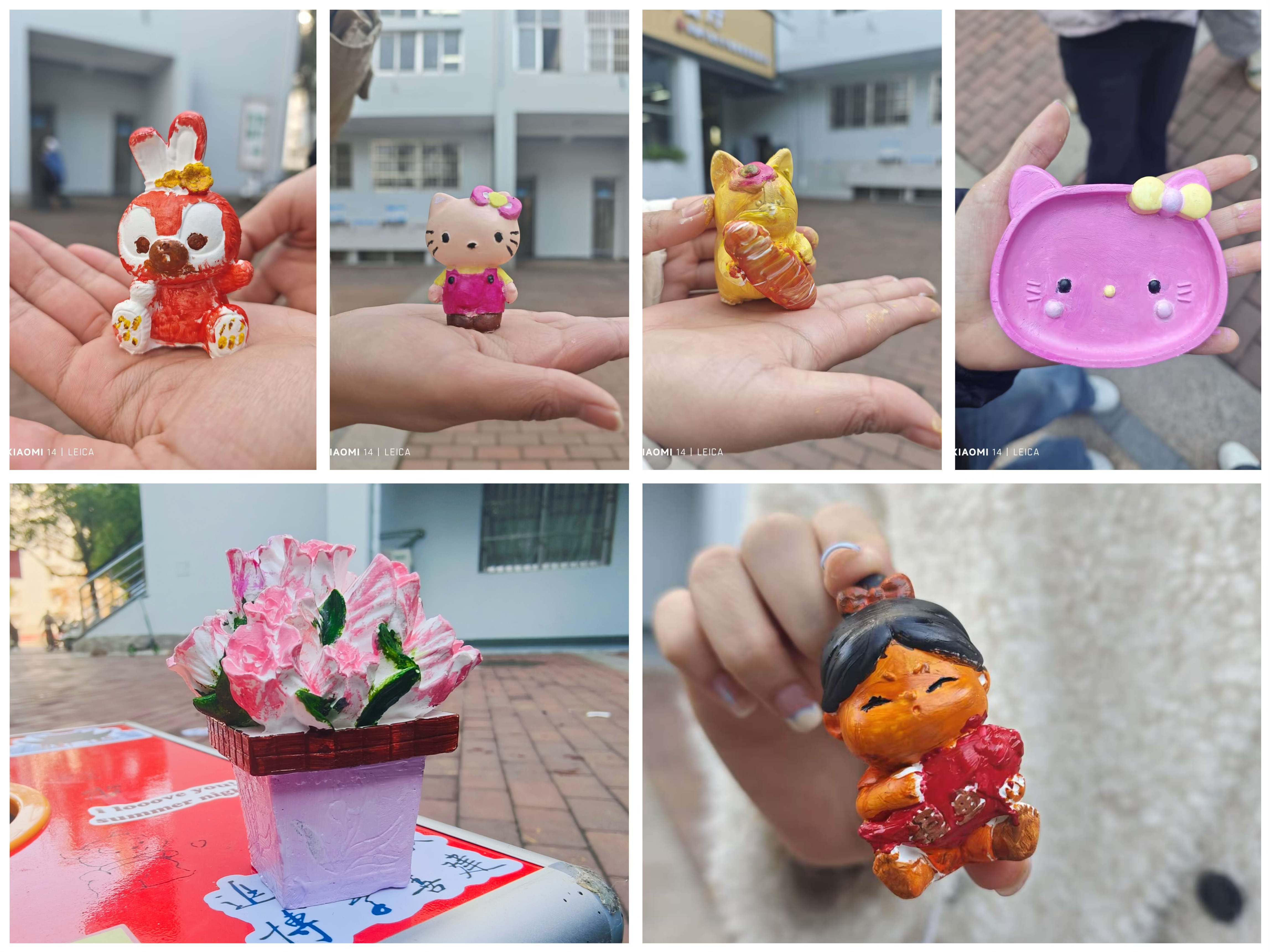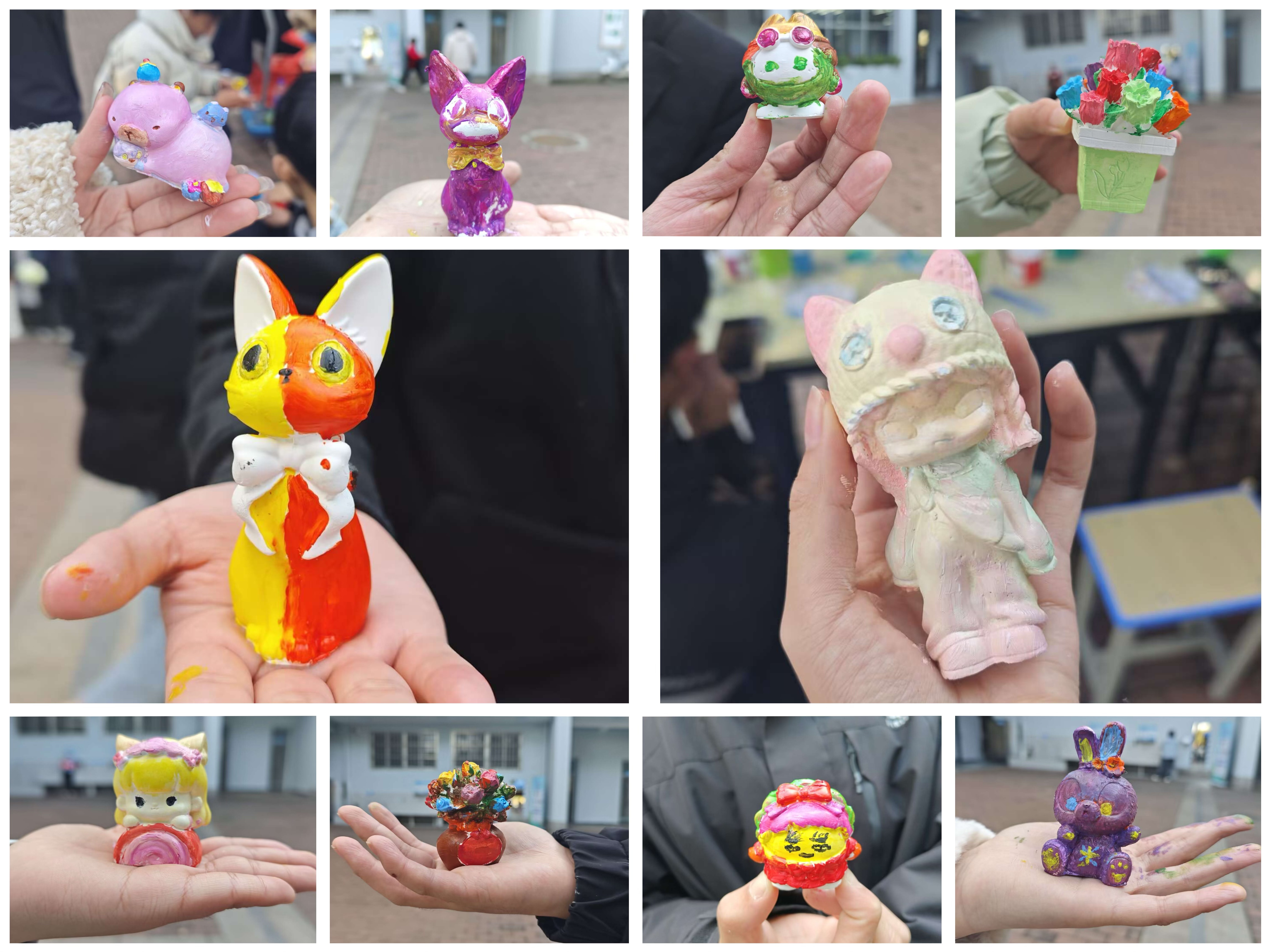 学院学生会为本次活动准备了石膏娃娃、画笔、颜料等。感兴趣的同学们可以在在众多石膏娃娃之中挑选一个,在纯白的石膏娃娃上尽情挥洒创意。活动现场气氛轻松愉悦,有的同学眉头微皱,似乎在思考颜色的搭配;有的同学挥动画笔,沉浸在色彩的海洋里;有的同学在与朋友讨论,在交流中碰撞灵感的火花。经过大家的认真创作,一个个色彩丰富、栩栩如生的雕塑作品精彩呈现。